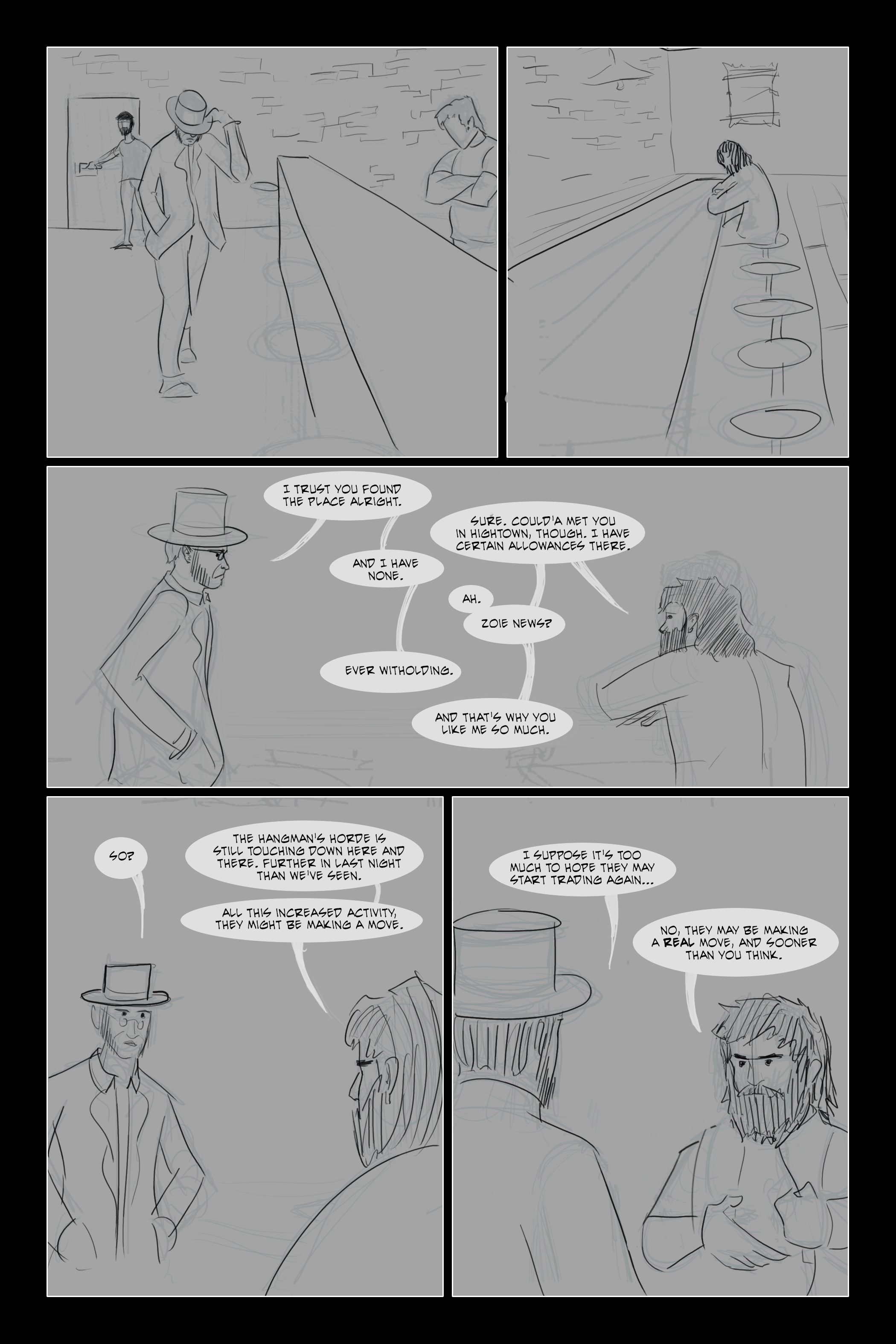 Subject enters a dimly lit speakeasy and goes to the end of the bar where sits the Gruff Man who confronted Ricky in the Midtown alley. From their brief opening exchange, we can deduce several details: Subject is from Hightown, the colloquial name for Boomtown’s upper-class localities. He is closely watched there, so their meeting is necessarily in Lowtown despite the Hightown allowances afforded the Gruff Man. They both know a woman named Zoie who seems to possess but withhold information, so Subject must come to the Gruff Man for the information he seeks. They are also both familiar with the Hangman’s Horde and their modus operandi of sermonizing and slaughtering any who refuse to convert to their cause.